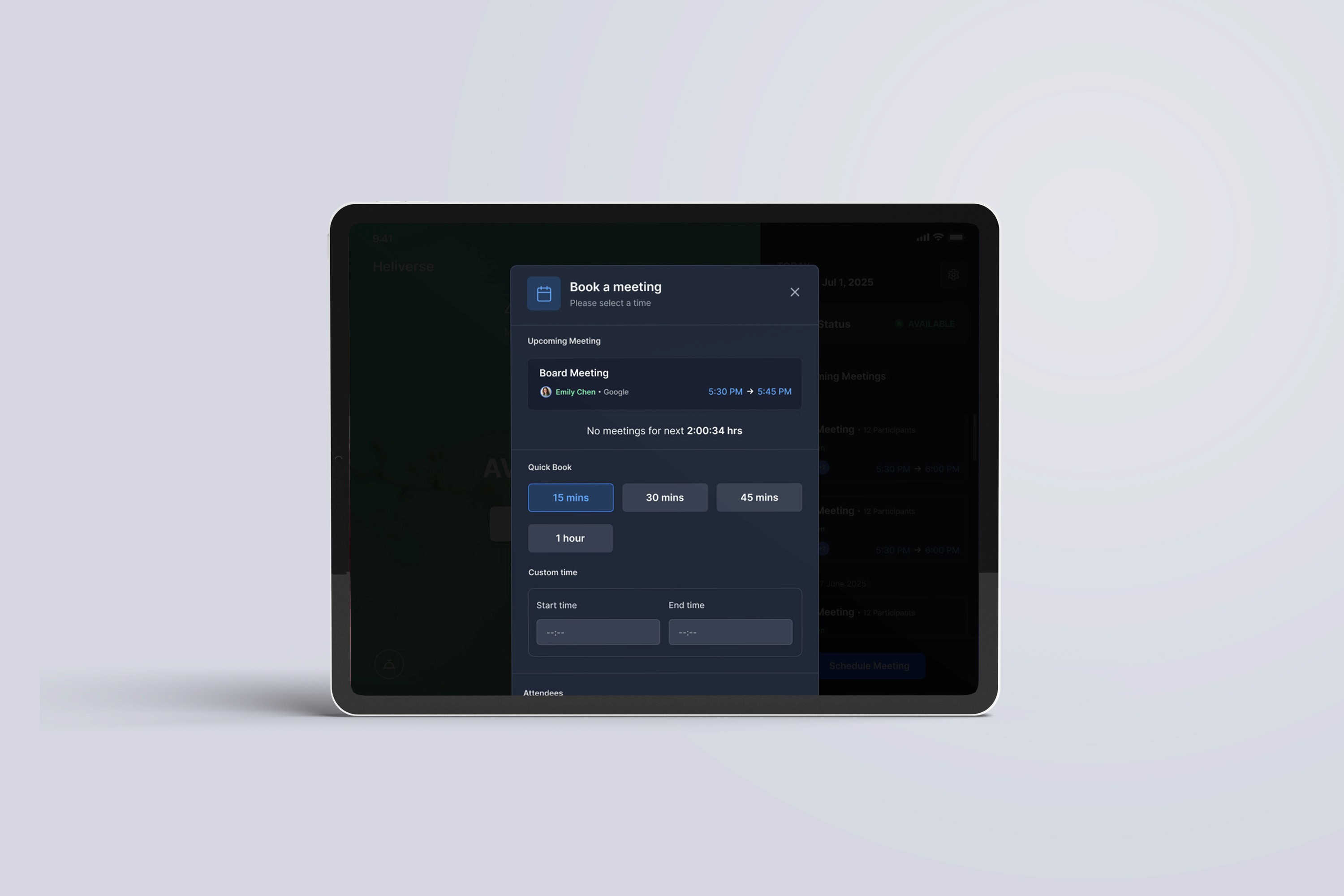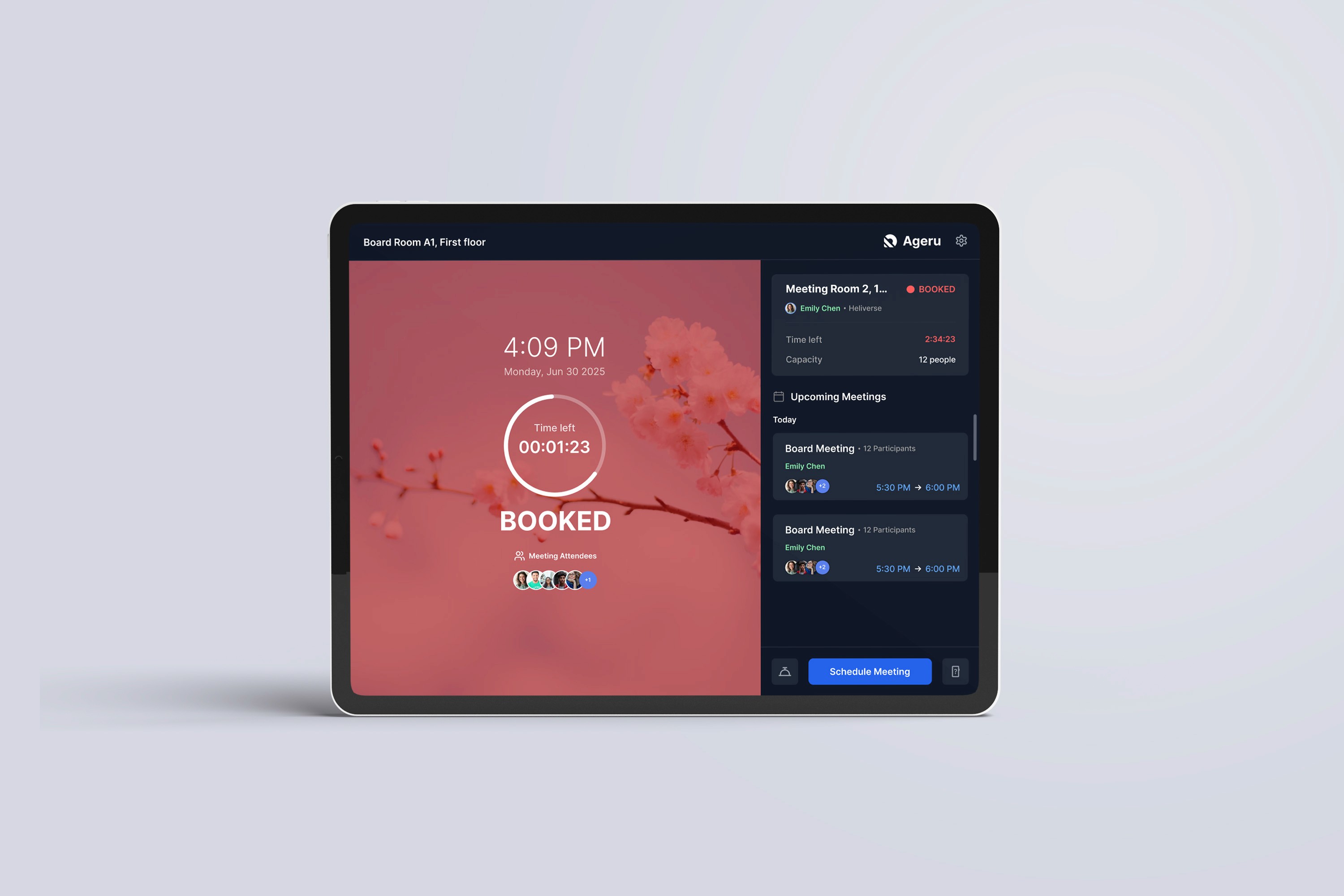 The client, a meeting room booking service based out of Gurgao, was experiencing several challenges related to meeting room usage, scheduling, and support service coordination: Key Problems Inefficient meeting booking workflows: Users had to rely on separate devices (laptops or mobile phones) to create or modify meetings, invite attendees, or update meeting details. Lack of real-time interactivity: The room display couldn’t be used to edit meeting titles, assign organizers, or input attendee emails directly. No direct way to request room services: Users had no way to request services like cleaning, catering, or IT support from the room interface, and facility teams were not receiving timely notifications. Poor meeting visibility: Users couldn’t easily view current meeting details, organizer names, or how much time was left in the meeting. Unclear room status: The display did not visually indicate whether the room was booked, free, or pending confirmation. Inconsistent branding: The interface lacked customization options to reflect corporate colors, logos, or themes.