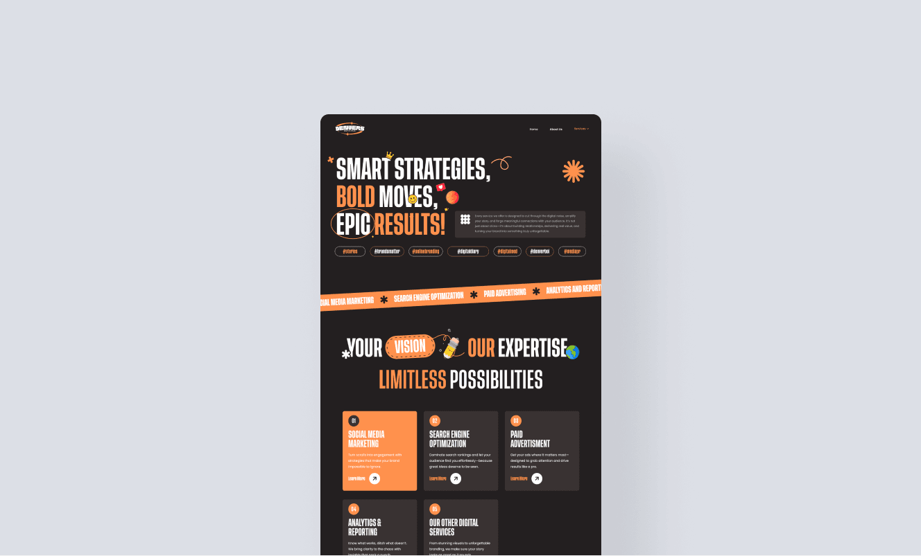 I designed a new website UI that highlights the agency’s strengths through bold visuals and clear, concise messaging. By restructuring the homepage, showcasing service pillars, and simplifying navigation, I made it easy for users to understand Digital Dojo’s story and quickly access essential information. The improved design encourages exploration and drives meaningful engagement. To address the problem of user retention, I transformed the website UI into a funky, colorful, and visually dynamic experience. I introduced bold color palettes and playful shapes throughout the interface, making the brand personality instantly visible. This aligns with current trends, where digital marketing agencies benefit from a standout and an energetic presence. The design now looks fresh, exciting, and memorable in today’s competitive space.
